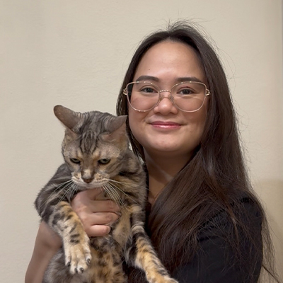 She earned her Doctor of Veterinary Medicine (DVM) degree from the University of the Philippines and is currently completing the ECFVG (Educational Commission for Foreign Veterinary Graduates) certification, which aligns international veterinary training with U.S. standards. Her main area of interest is internal medicine, where she enjoys the challenge of diagnosing and treating complex cases.